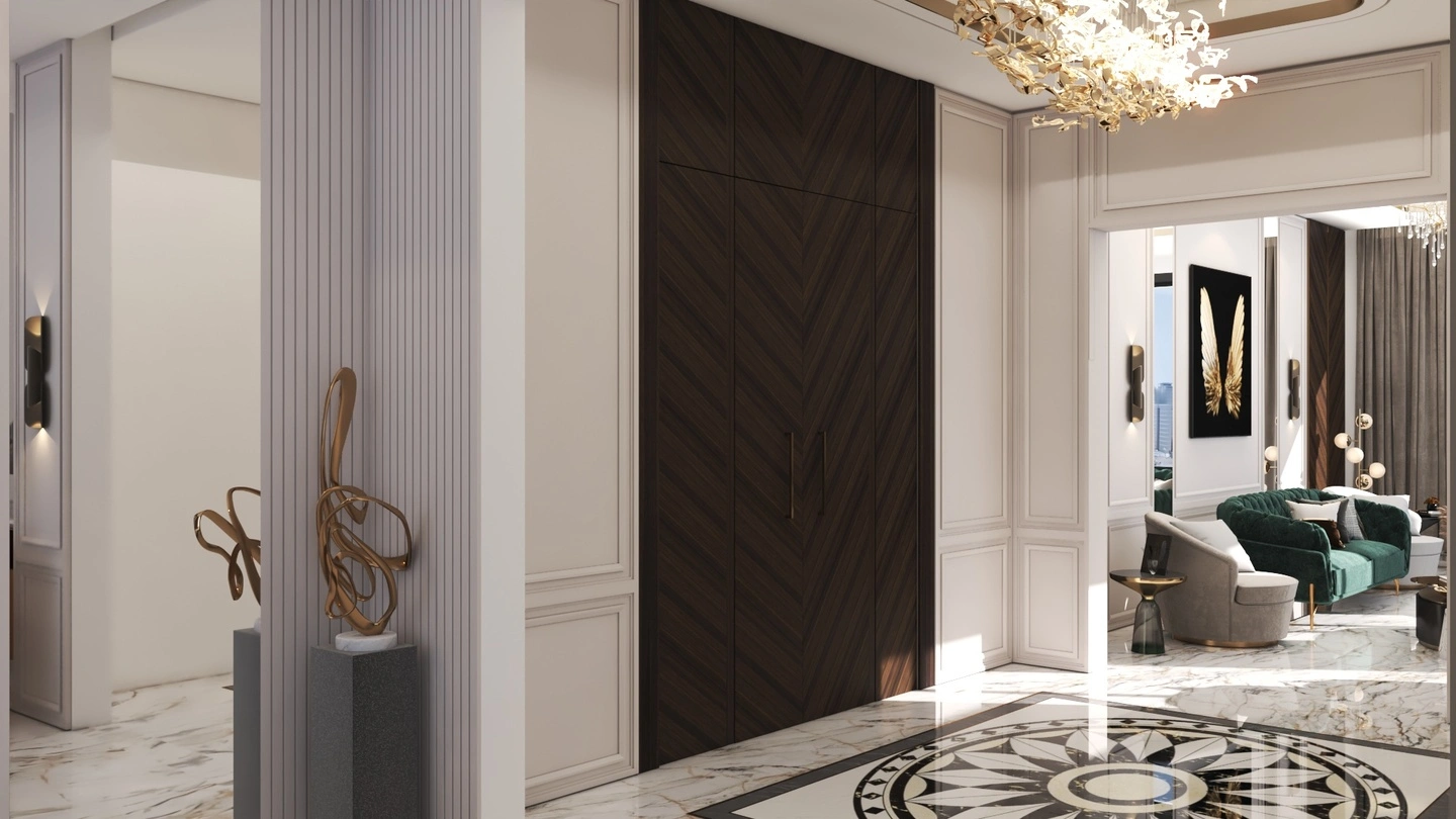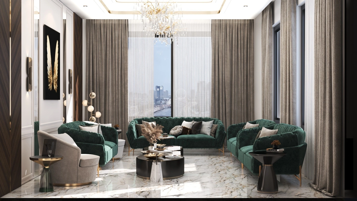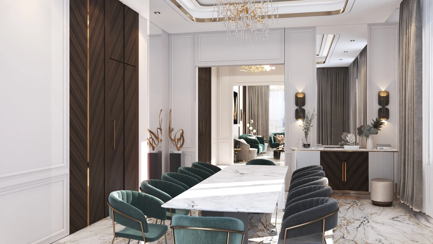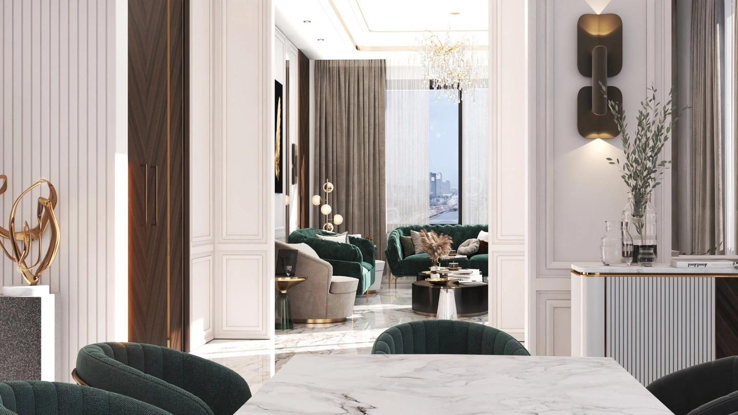 The walls and furnishings are done in shades of green, white, and beige, creating a cohesive and cohesive look. The use of green, white, and nude tones creates a classic and timeless look that is both stylish and calming.