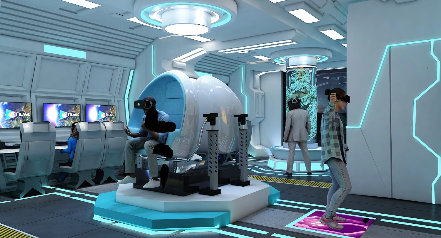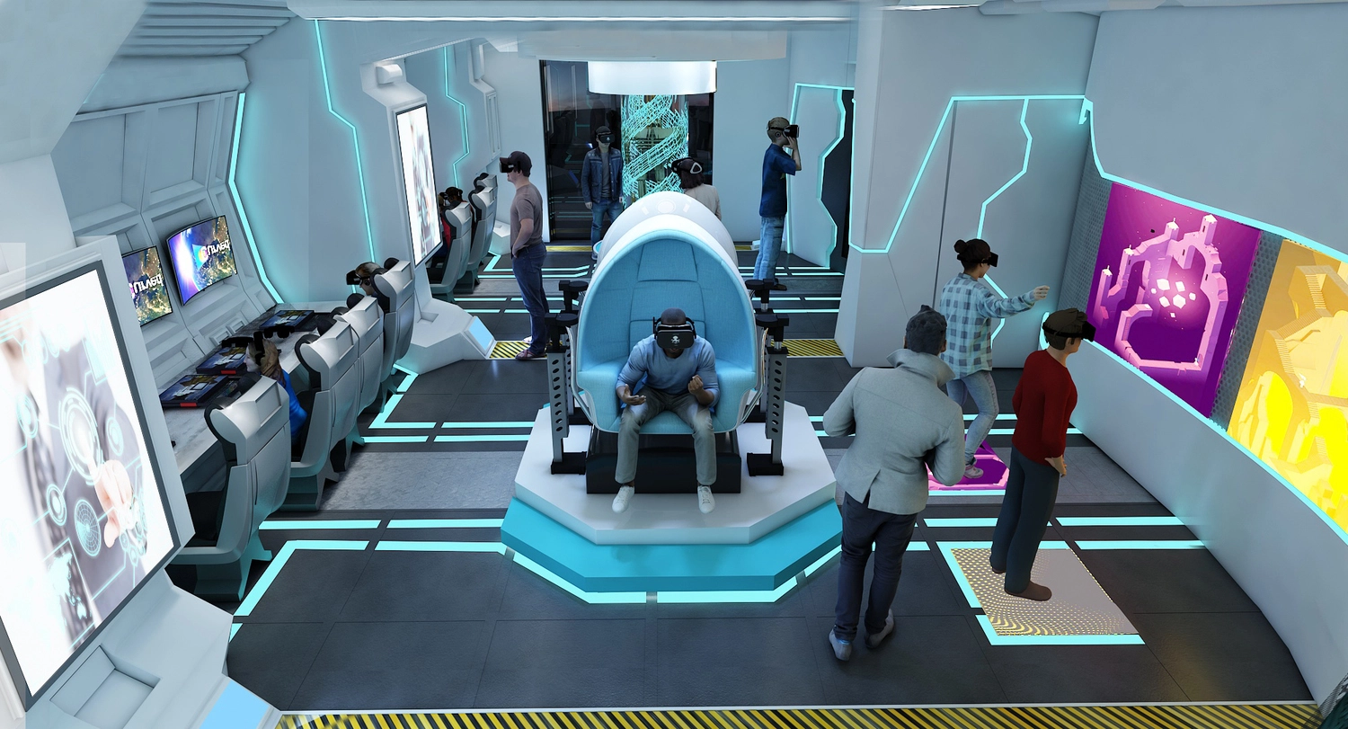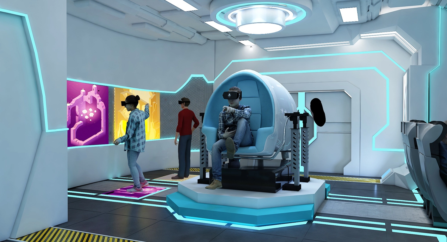 The gaming space's interior is done in a range of bright, neon colors, creating a vibrant and energetic atmosphere.